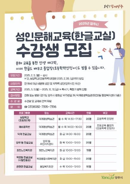 (중부시사신문) 양주시가 ‘2025년 성인문해교육(한글교실) 지원 사업’의 수강생을 상시 모집한다고 12일 밝혔다.