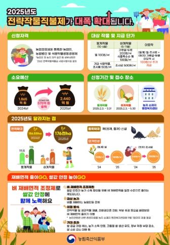 전략작물직불금 사업은 식량자급률을 높이고 쌀 수급 안정에 중요한 전략작물의 안정적 생산 확대를 위해 논(벼를 과거에 한 번이라도 재배했던 농지)에 벼 대신 전략작물을 재배하면 보조금을 지급하는 사업이다.