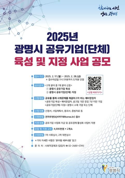 시는 17일부터 이달 28일까지 공유기업을 육성하고 공유기업·단체를 지정하는 ‘2025년 광명시 공유기업(단체) 육성 및 지정 사업’ 참여자를 신청 받는다.