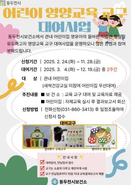 동두천시 관계자는 “교구 대여 사업을 통해 어린이들이 건강하고 올바른 식습관을 조기에 형성하는 데 도움이 되길 바란다”라고 말했다.