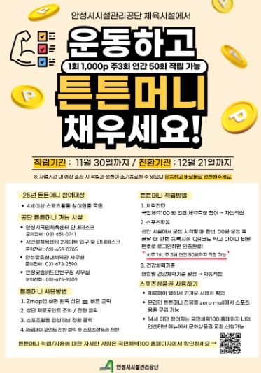 ‘튼튼머니’는 국민체력 100 회원가입 후 운동 시작할 때 한번, 30분 운동 후 끝날 때 한번 QR코드를 인증하면 자동으로 포인트가 적립된다. QR코드는 안성시국민체육센터 안내데스크, 서안성체육센터 2게이트 입구 및 안내데스크, 안성맞춤실내체육관 사무실, 안성맞춤 배드민턴구장 사무실에서 확인할 수 있다.