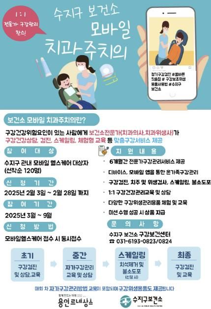 (중부시사신문) 용인특례시 수지구보건소는 맞춤형 구강건강 관리사업인 ‘모바일 치과주치의 사업’에 참가자 120명을 선착순으로 모집한다고 18일 밝혔다.