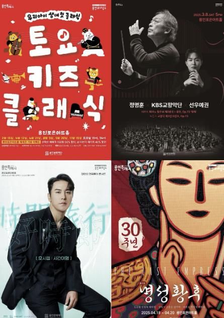 3월 8일 대한민국을 대표하는 마에스트로 정명훈의 지휘로 ‘베토벤 피아노 협주곡 5번 황제’를 연주하는 ‘정명훈xKBSx선우예권’의 공연과 ▲이문세 콘서트 ‘2024-25 Theatre 이문세(3월 14일~15일) ▲장민호 콘서트(3월 22일~23일) ▲뮤지컬 ’명성황후‘ (4월 18일~20일) ▲사랑의 하츄핑(5월 24일~25일) ▲일루셔니스트 이은결 30주년 기념 매직쇼 ’TRACK’(6월 28일) ▲대니구 윈터 콘서트 ‘HOME’(12월 20일) ▲고잉홈프로젝트(피아노 손열음) ‘라벨 교향악곡 전곡 시리즈Ⅲ(12월 27일) 공연이 용인포은아트홀에서 차례로 열린다.