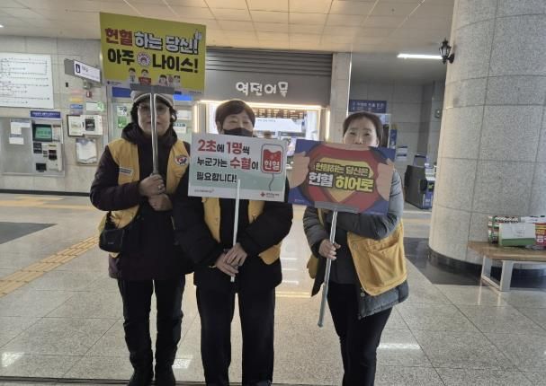 (중부시사신문) 대한적십자사봉사회 동두천지구협의회 소속 봉사원들과 관내 봉사회의 봉사원들은 19일 지행역 일대에서 헌혈 홍보에 나섰다.