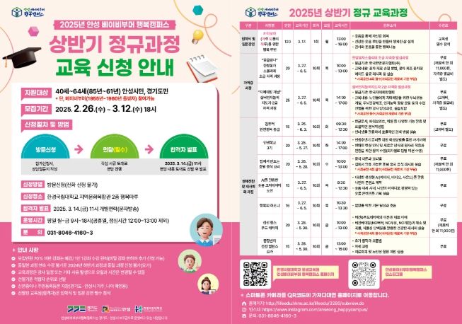 2025년 상반기 정규과정 모집일정은 2월 26일부터 3월 12일까지이며 신청방법은 방문접수로 진행한다. 신청대상은 안성시민(경기도민) 1985년생부터 1955년생으로 나이 제한이 있으며, 수강료는 전액 무료다.
