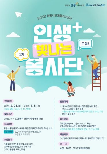 (중부시사신문) 광명시 인생플러스센터는 오는 24일부터 3월 5일까지 신중년 세대의 사회적 경험과 전문성을 활용해 지역 공동체 활성화에 기여하는 ‘2025년 인생+빛나는 봉사단’ 신규 봉사자 및 활동처를 모집한다.