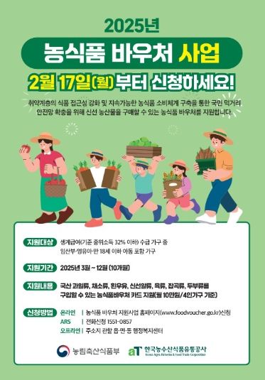 농식품 바우처 지원 사업은 12월 12일까지 신청할 수 있으며, 신청 방법은 주소지 관할 동 행정복지센터에 방문하거나 온라인 또는 전화를 통해 신청할 수 있다.