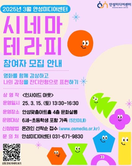 (중부시사신문) 안성미디어센터는 2025년 3월 ‘시네마 테라피’ 프로그램 참가자를 모집한다. 이번 프로그램은 3월 15일 토요일 오후 1시 30분에 안성맞춤아트홀 4층 문화살롱에서 진행되며, 상영작은 픽사 애니메이션 '인사이드 아웃'이다.