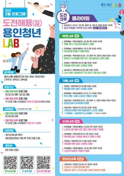 용인에 거주하는 18세 이상 39세 이하 청년이라면 누구나 모든 프로그램에 무료로 참여할 수 있다. 모집 기간은 29일까지다.
