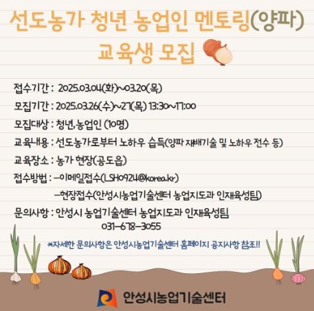 (중부시사신문) 안성시농업기술센터는 오는 3월 4일부터 20일까지 양파 선도농가 멘토링 교육생을 모집한다.
