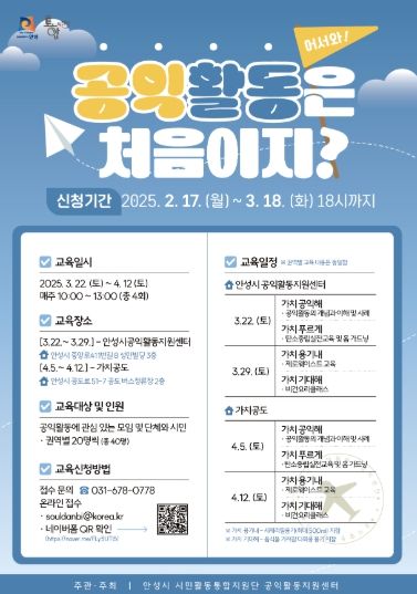특히, 공익활동에 관심 있는 시민 누구나 참여할 수 있도록 동부시내권(공익활동지원센터 가치마당), 서부권(공도 시외버스정류장 가치공도)에서 권역별(각 2주차)교육을 오는 3월 22일부터 4월 12일 매주 토요일에 진행한다.