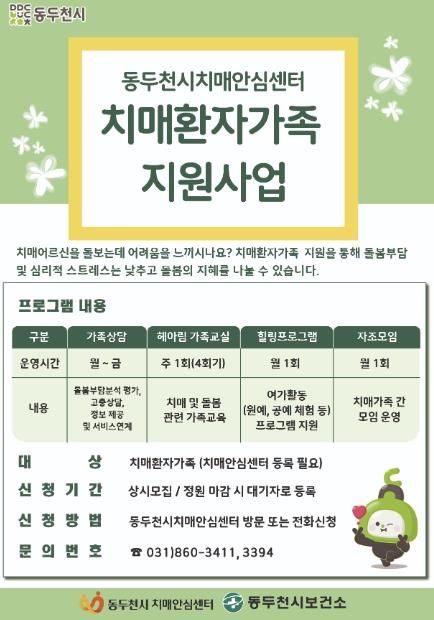 동두천시치매안심센터 관계자는 “다양한 가족 지원 사업을 통해 가족들의 사회적 고립과 돌봄 부담이 줄어들기를 바라며, 치매 환자와 가족들이 건강하고 행복한 삶을 누릴 수 있도록 최선을 다하겠다”라고 말했다.