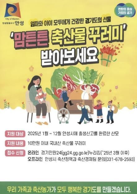 이에 따라, 경기도에 주소를 두고 2025년 1월 1일부터 12월 31일까지 안성시에 자녀 출생신고를 마친 산모에게 10만원 상당의 국내산 축산물 꾸러미가 지원된다.