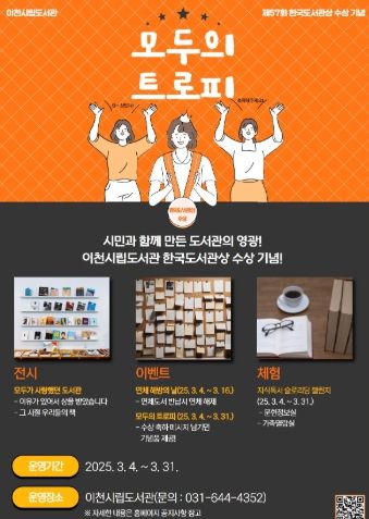 (중부시사신문) 이천시립도서관이 2025년 제57회 한국도서관상(단체상) 수상을 기념하여, 도서관의 성과를 시민들과 함께 나누고 독서문화를 확산하기 위한 ‘모두의 트로피’ 행사를 오는 3월 4일부터 3월 31일까지 시립도서관에서 운영한다.
