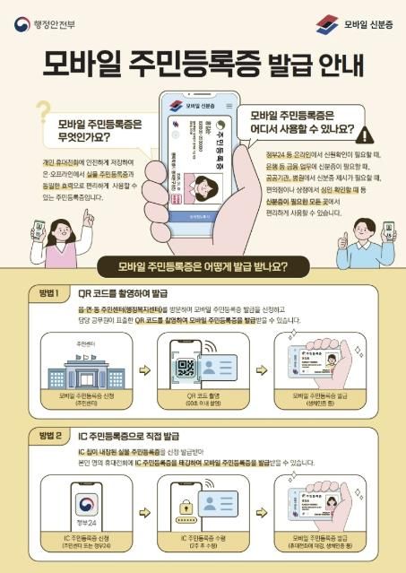발급 방법은 본인 명의 휴대전화에 ‘대한민국 모바일 신분증’ 앱(App)을 설치한 후 ▲ QR코드를 통한 발급 ▲ IC 주민등록증 발급 등 두 가지 방법 중 선택하여 신청할 수 있다.
