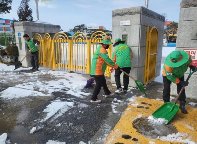 방재단은 대설주의보가 발표되자 자율방재단 50여 명을 긴급 소집하여 개학을 앞두고 학생들이 안전하게 통행할 수 있도록 학교 주변 주요 통행로와 인도 등 학교 주변 눈을 치우고 도로가 결빙되지 않도록 제설제를 살포했다.