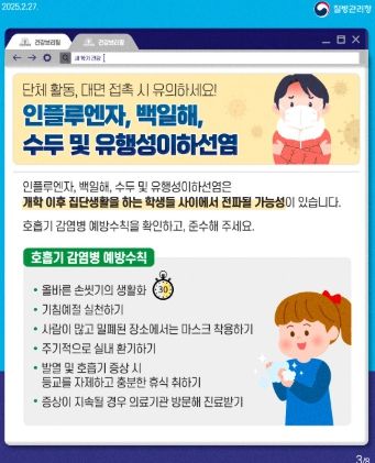 이천시 보건소 관계자는 “올바른 손 씻기와 기침 예절을 실천하는 것이 감염 예방의 기본”이라며, “증상 발생 시 즉시 의료기관을 방문해 진료받고, 감염 확산을 막기 위해 증상이 회복될 때까지 등교를 자제하는 것이 중요하다”라고 강조했다. 이어 "안전하고 건강한 새 학기를 위해 학생과 학부모 모두가 예방수칙을 철저히 지켜줄 것"을 당부했다.