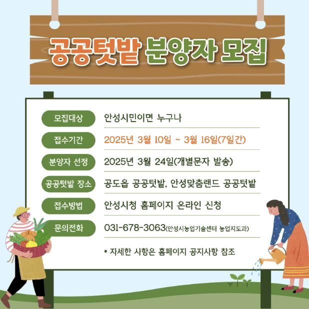 (중부시사신문) 안성시농업기술센터는 오는 3월 10일부터 16일까지 도시농업공동체 공공텃밭(이하 공공텃밭)의 분양자를 모집한다고 밝혔다.