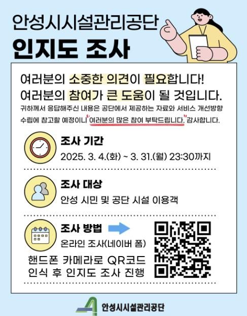 조사 문항은 ‘공단에 대한 인지 경로’, ‘공단 시설 이용 현황’ 등 총 12개의 항목이며 안성 시민 및 공단 시설 이용객이 참여할 수 있다.