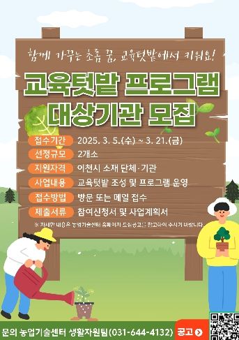 (중부시사신문) 이천시는 도시농업 기반 조성과 활성화를 위해 오는 3월 21일까지 2025년 도시농업 교육텃밭 프로그램 대상자를 모집한다.