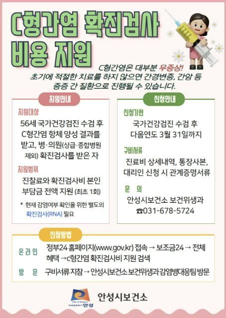 (중부시사신문) 안성시는 56세 국가건강검진에서 C형간염 항체 양성 판정을 받은 시민을 대상으로 확진검사비 지원 신청을 받는다.