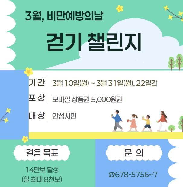 챌린지는 안성시민을 대상으로 3월 10일부터 31일까지 총 22일간 진행되며, 참가자들은 목표 걸음 수인 14만보(1일 최대 8천보 인정)를 달성하면 모바일 상품권 5천 원권을 받을 수 있다.