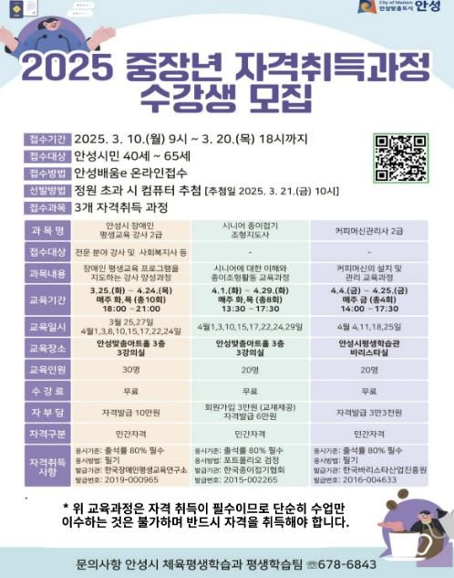안성시는 이번 자격취득 과정을 통해 중장년층의 역량 강화를 지원하고, 안정적인 미래 설계를 돕는 데 주력할 방침이다.