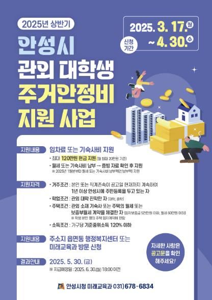 안성시 관계자는 “이번 지원사업을 통해 관외 대학생들이 학업에 더욱 집중할 수 있길 바라며, 앞으로도 다양한 교육 지원 정책을 마련해 나가겠다”고 말했다.