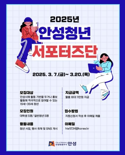 (중부시사신문) 안성시는 청년의 눈높이에 맞는 홍보활동을 강화하고 청년사업 및 행사에 대한 참여와 관심을 확대하기 위해 ‘2025년 안성청년 서포터즈단’을 모집한다고 밝혔다.