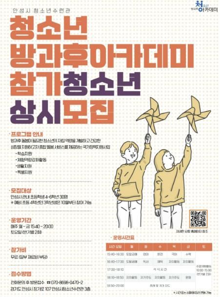 한편 안성시청소년수련관 청소년방과후아카데미 ‘또바기’는 방과 후 돌봄이 필요한 초등학생 4학년~6학년 청소년을 대상으로 ▲학습지원(영어, 국어, 수학) ▲체험·역량강화활동 ▲주말체험 ▲생활지원(급식, 귀가 차량 지원) 등 전문적이고 다양한 프로그램을 무료로 지원하고 있으며 현재 참가자를 모집하고 있다.