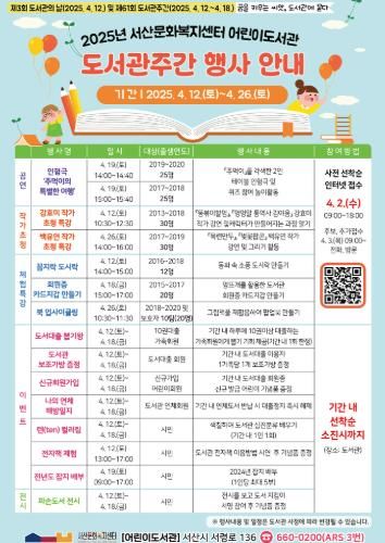 (중부시사신문) 서산문화복지센터 어린이도서관은 제3회 도서관의 날 및 제61회 도서관주간을 맞아 ‘꿈을 키우는 씨앗, 도서관에 묻다’ 라는 공식 주제로 4월 12일부터 26일까지 도서관주간 행사를 운영한다고 밝혔다.
