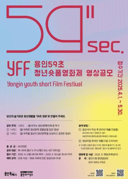 (중부시사신문) 용인특례시는 오는 4월 1일부터 5월 30일까지 ‘나의 [ ]을(를) 바꾸는 청년정책’을 주제로 총 상금 400만원의 ‘용인 59초 청년 숏폼 영화제’에 참여할 영상을 공모한다.