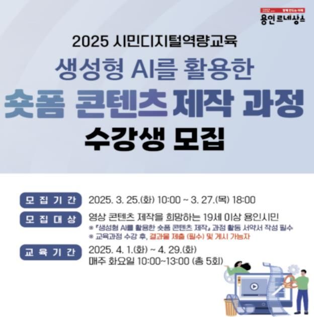 (중부시사신문) 용인특례시는 시민을 대상으로 디지털 역량 강화를 위해 ‘생성형 AI를 활용한 숏폼 콘텐츠 제작 과정’ 교육을 마련했다고 19일 밝혔다.