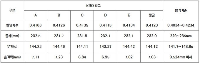 이번 검사는 KBO 리그 단일 경기사용구인 ㈜스카이라인스포츠 AAK-100의 샘플 5타를 무작위로 수거한 뒤 지난 3월 21일(금)부터 24일(월)까지 국민체육진흥공단(KSPO) 한국스포츠개발원 스포츠용품 시험소에 의뢰해 진행했다. 검사 결과, 모든 샘플이 합격기준을 충족한 것으로 확인됐다.