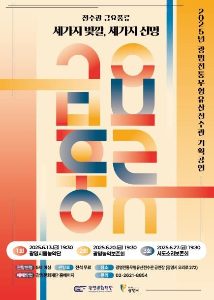 (중부시사신문) (재)광명문화재단은 2025년 광명전통무형유산전수관 기획공연 '전수관 금요풍류-세가지 빛깔, 세가지 신명'을 오는 6월 13일, 6월 20일, 6월 27일 매주 금요일 오후 7시 30분에 광명전통무형유전수관 공연장에서 선보인다.