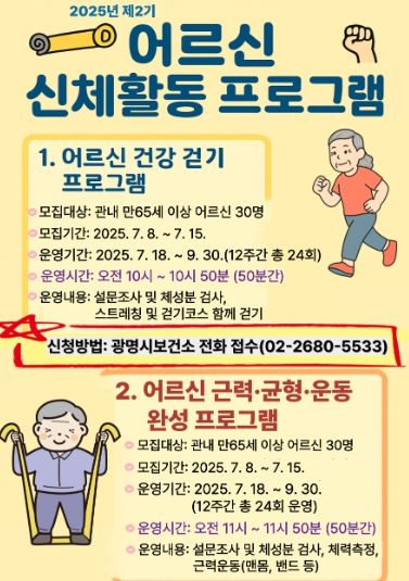 (중부시사신문) 광명시는 오는 8일부터 15일까지 어르신의 건강한 일상 유지를 돕기 위한 ‘제2기 어르신 신체활동 프로그램’ 참여자를 선착순 모집한다.