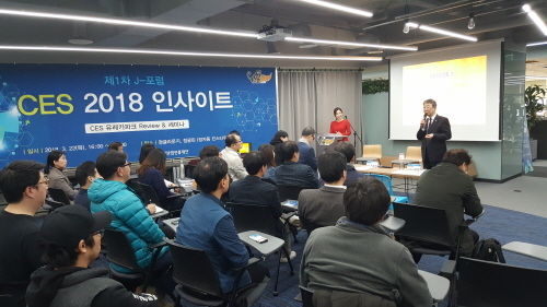 성남산업진흥재단(대표이사 장병화)는 3월 22일(목) 성남시 분당구 정자동에 있는 성남창업센터 정글on 19층에서 4차 산업혁명시대에 발맞춰 세계 최대 테크 전시회 CES 2018 주요 이슈를 소개하고 CES 2019 참가 정보 공유를 위한 '제1차 J-포럼'을 개최했다.