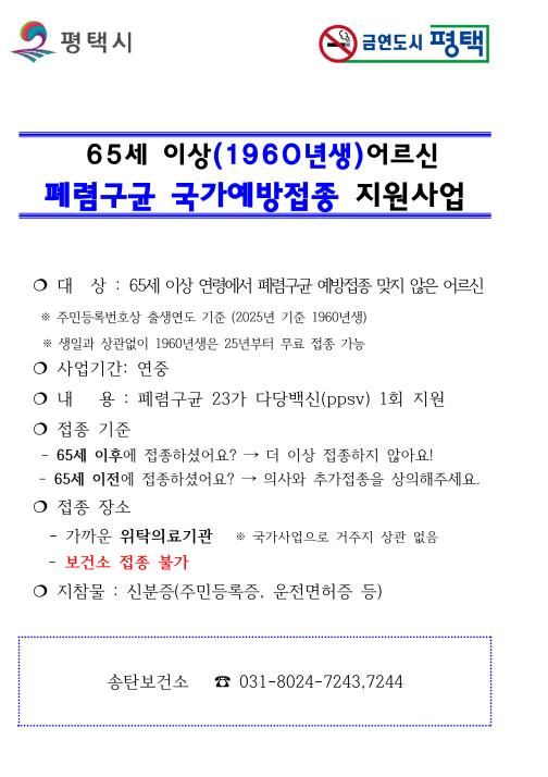 접종대상은 올해 65세 어르신(1960년 12월 31일 이전 출생자)으로, 폐렴구균(PPSV23가)
