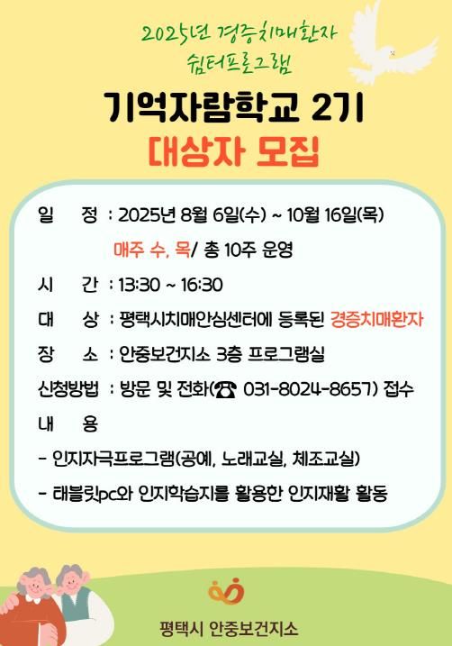 (중부시사신문) 평택시 안중보건지소는 오는 8월 6일부터 10월 16일까지, 매주 수, 목 오후 1시 30분부터 4시 30분까지 경증 치매 환자의 인지 기능 강화와 정서적 안정을 돕기 위한 쉼터 프로그램 '기억자람학교 2기'를 운영할 예정이다.