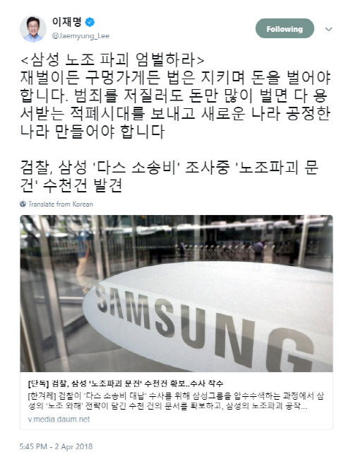 이재명 더불어민주당 경기도지사 예비후보가 검찰이 발견한 삼성그룹의 노조 와해 전략이 담긴 수천 건의 문서와 관련해 2일 트위터를 통해 “삼성의 노조 파괴를 엄벌하라”며 강하게 비판했다.