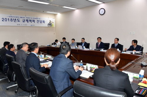 성남시는 시민들과 기업의 목소리를 반영한 5건의 규제를 발굴하고 국무조정실 민관합동규제개선추진단, 경기도 규제개혁추진단과 함께 2018년 규제혁파 간담회를 4월 4일 부시장회의실에서 진행했다.