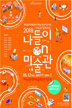 따스한 5월의 봄날 가족과 함께하는 하남 청년작가전 〈나들이 on 미술관〉展이 하남문화예술회관 야외부지에서 이달 5월 12일(토)에 열린다. 야외에서 펼쳐지는 특별한 전시회 야외전시 하남 청년작가전 〈나들이 on 미술관〉 展에서는 예년보다 큰 규모로 전국 청년작가들의 우수한 작품들을 만나볼 수 있으며 온 가족이 즐길 수 있는 미술체험프로그램 및 다양한 이벤트 행사가 펼쳐진다.