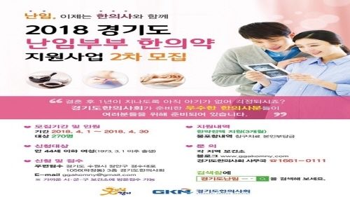 접수기간은 이번달 30일까지 이며, 대상자는 경기도에 거주하는 1973. 3. 1 이후 출생한 난임여성(만44세 이하)이며, 지원범위는 3개월간의 한약을 전액 지원한다.