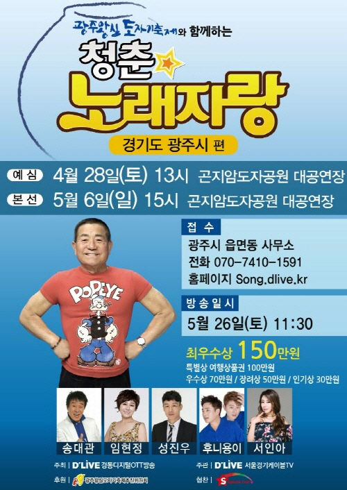 예심 참가신청은 오는 26일까지 광주시 읍·면·동사무소 방문접수와 딜라이브(D’LIVE) 디지털OTT방송 홈페이지 내 청춘 노래자랑 참여 게시판 (song.dlive.kr)을 통한 온라인 및 전화신청(070-7410-1591)도 가능하며 광주시민이라면 누구나 참여 가능하다.