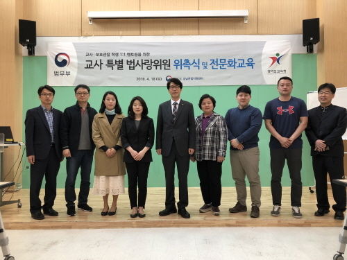 법무부 성남준법지원센터(소장 김시종)는 2018년 4월 18일 소내 강당에서 관내 성남·광주·하남시 중·고등학교 교사 9명이 참석한 가운데「2018년 교사 특별 법사랑위원 위촉식 및 전문화교육」을 실시하였다.