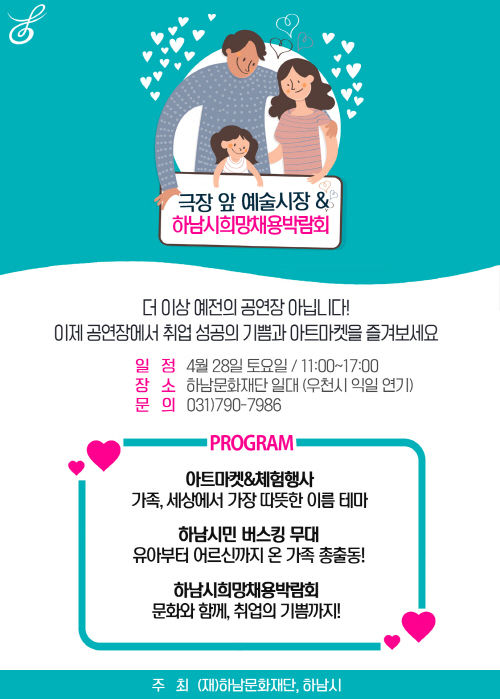 하남문화재단은 작년 성황리에 진행되었던 극장 앞 예술시장을 경력단절여성들을 비롯한 취업희망자들을 위한 하남시 희망채용박람회와 함께 4월 28일(토) 하남문화재단 일대에서 진행한다.