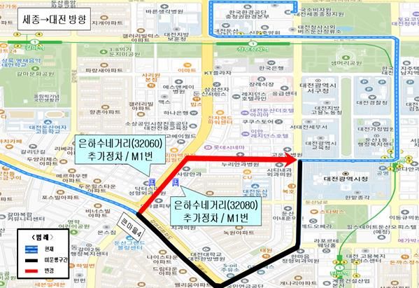 (중부시사신문) 세종특별자치시가 대전시와 공동 운행하는 광역 급행버스 M1 노선이 오는 12일 첫 차부터 대전 은하수 네거리를 추가로 정차한다.