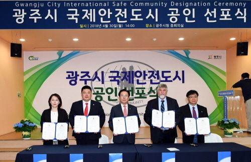 광주시는 30일 시청 중회의실에서 국제안전도시 공인 선포식을 개최했다.이날 선포식에는 조억동 시장을 비롯해 데일 핸슨 국제안전도시공인센터(ISCCC) 의장, 조준필 국제안전도시 지원센터장, 박남수 국제안전도시 심사평가 전문위원, 안전도시위원회 위원, 국제안전도시 관계자 등 150여명이 참석했다.