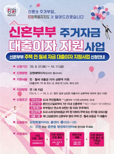 (중부시사신문) 강원특별자치도는 9월 27일부터 10월 17일까지 '신혼부부 주거자금 대출이자 지원사업' 대상자를 3차 모집한다고 밝혔다.
