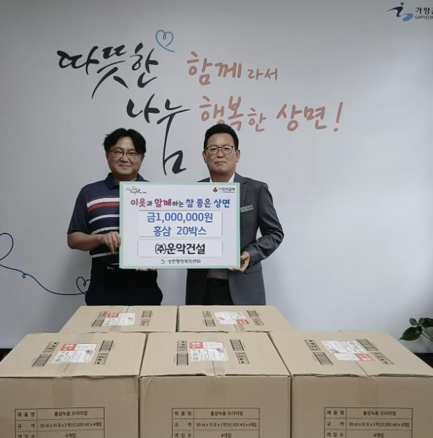 (중부시사신문) 가평군 상면 소재 건설업체인 운악건설은 최근 상면행정복지센터를 찾아 홍삼 20박스와 성금 100만 원을 전달했다.